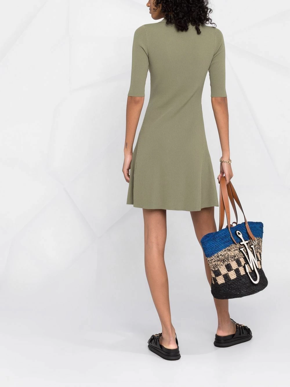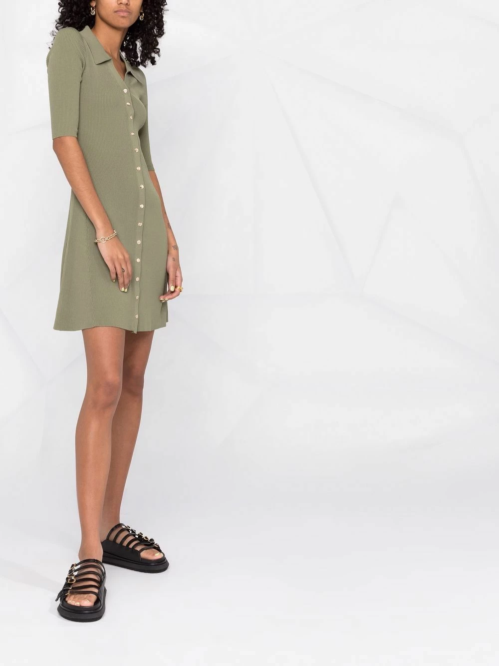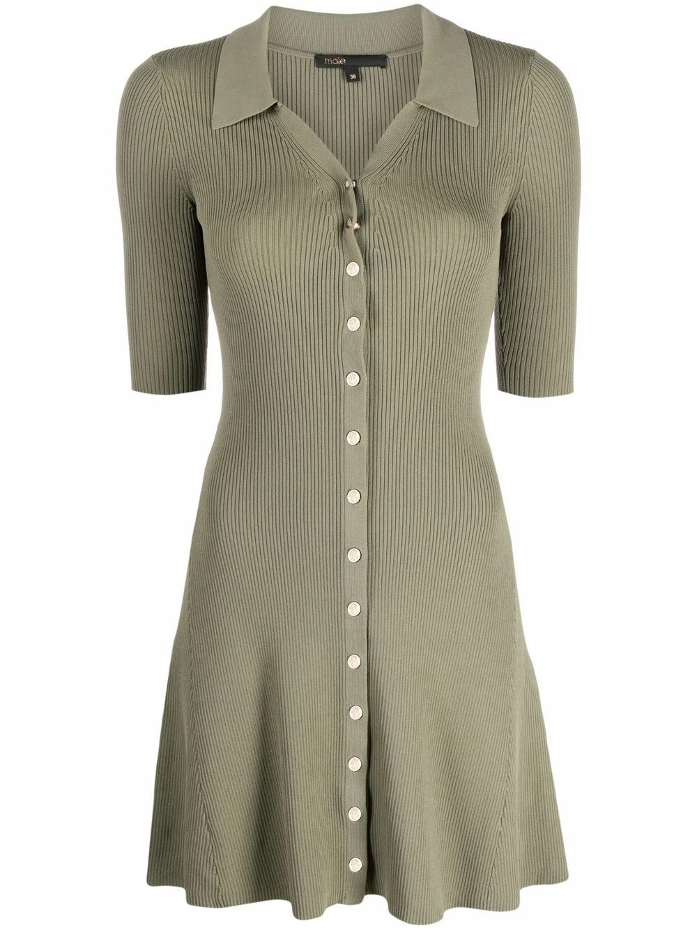 Maje opts for a khaki green hue for their ribbed knit shirt dress that gracefully flutters whenever worn because of its flared silhouette.