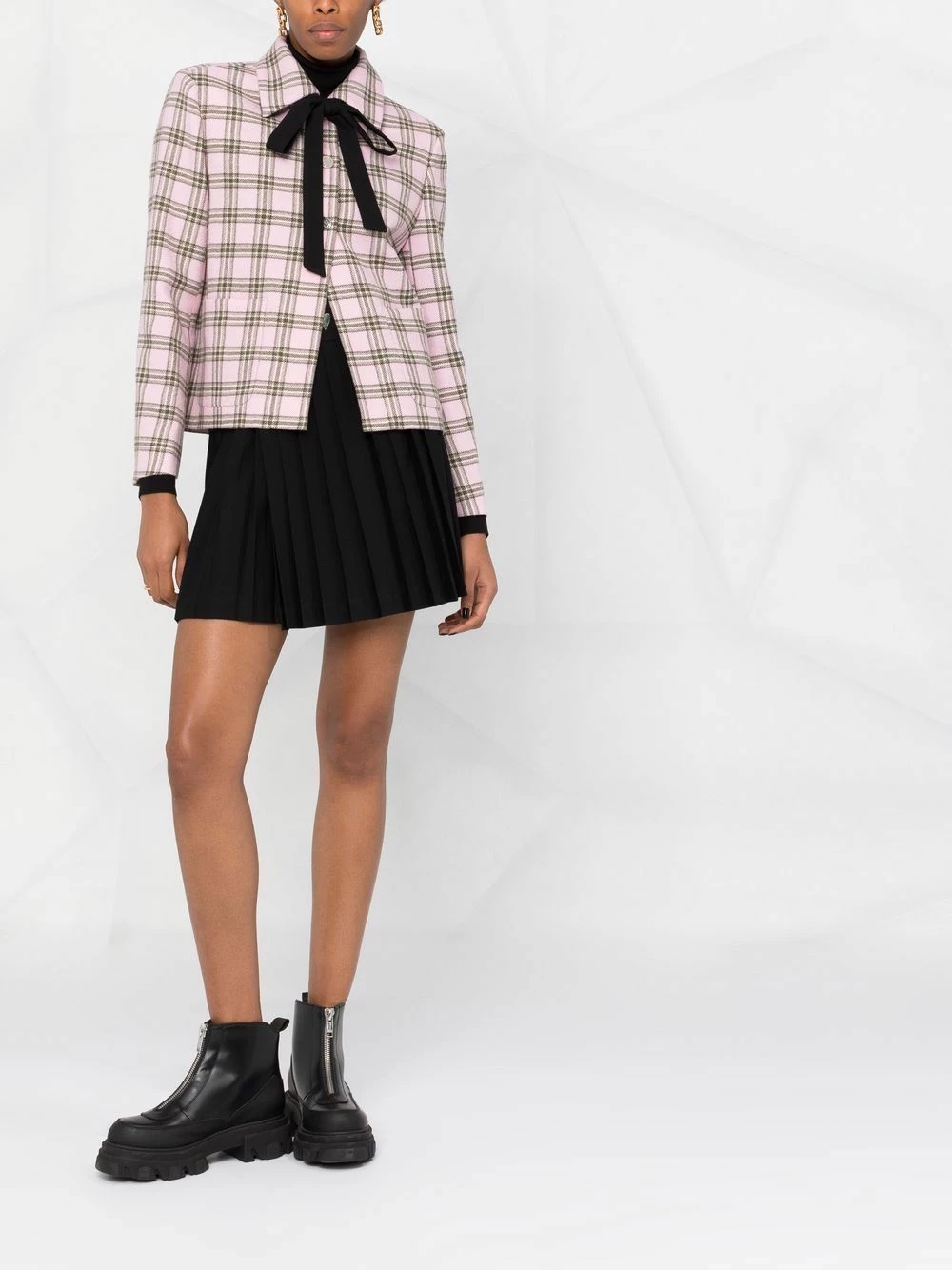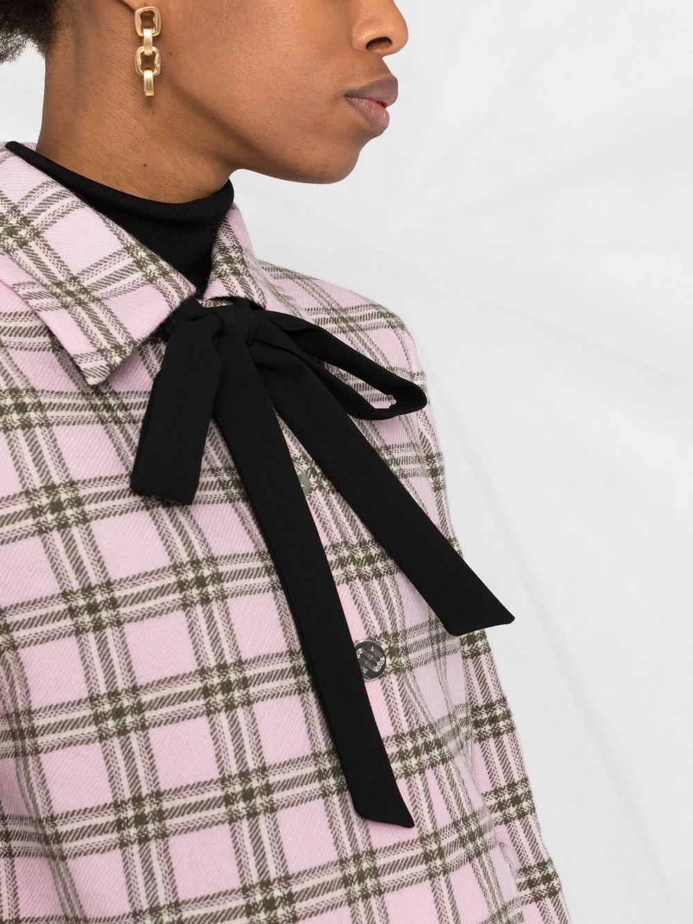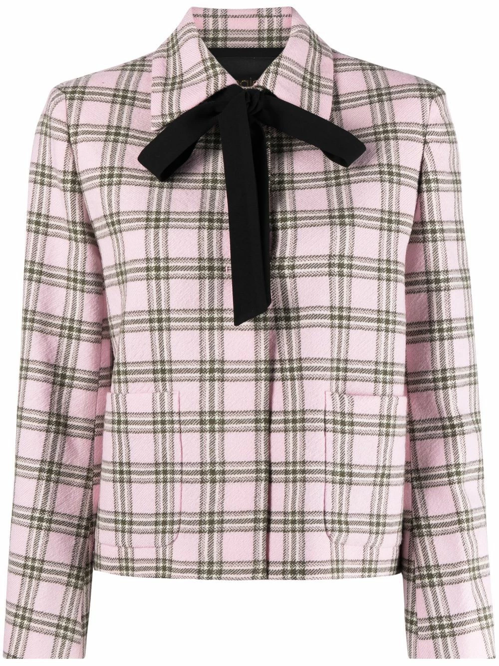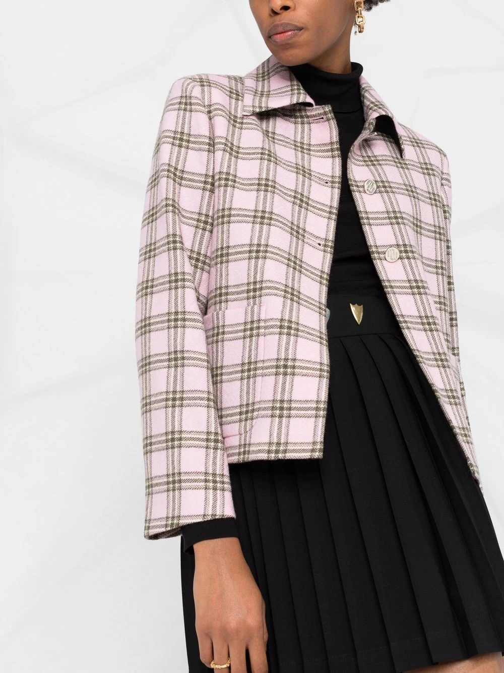 Pink virgin wool/stretch cotton blend check button-down jacket from Maje featuring check print, button-down collar and long sleeves.