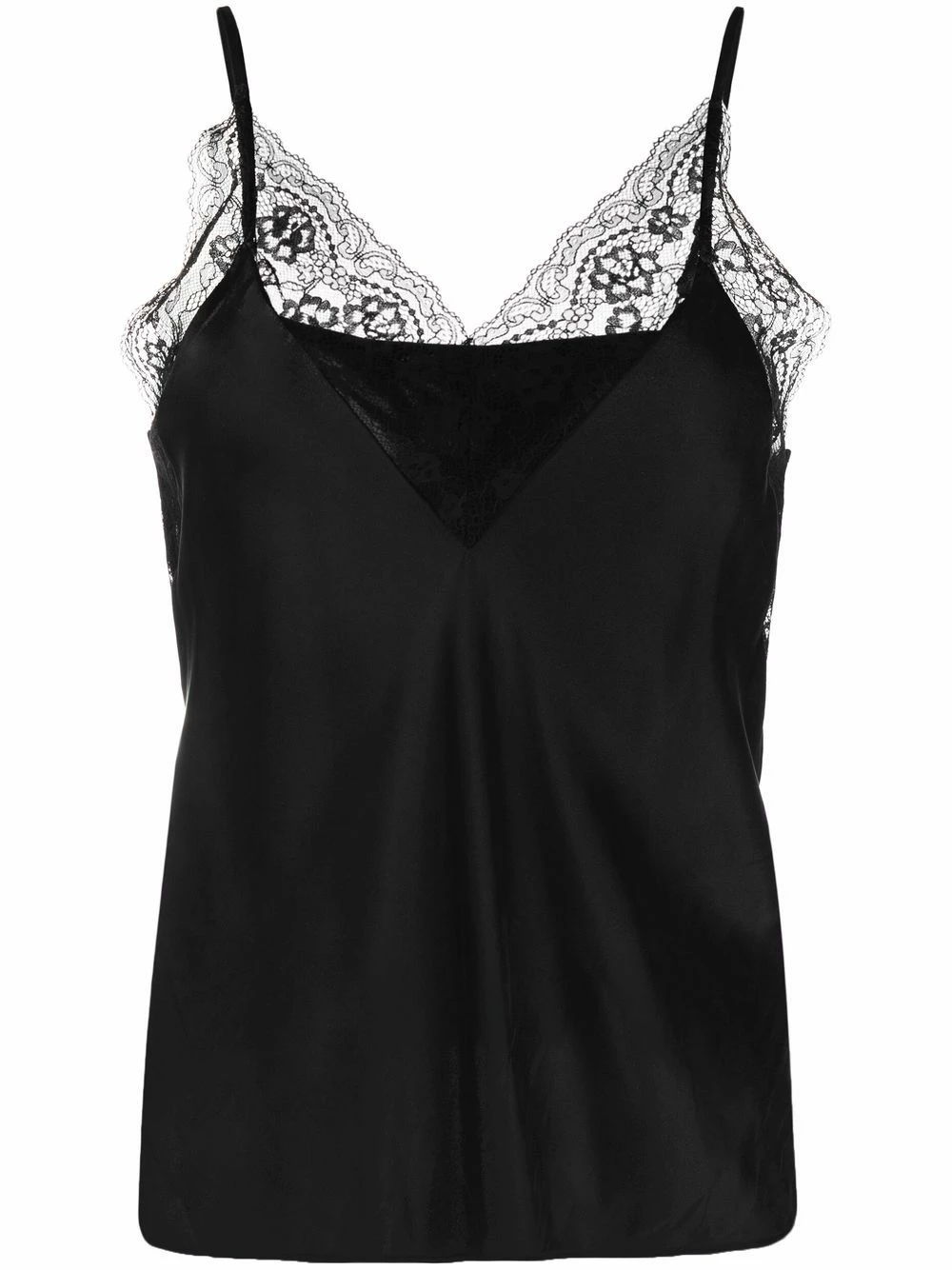 Crafted from soft silk, this black cami top from Maje is elegantly finished with a delicate floral lace trim.
