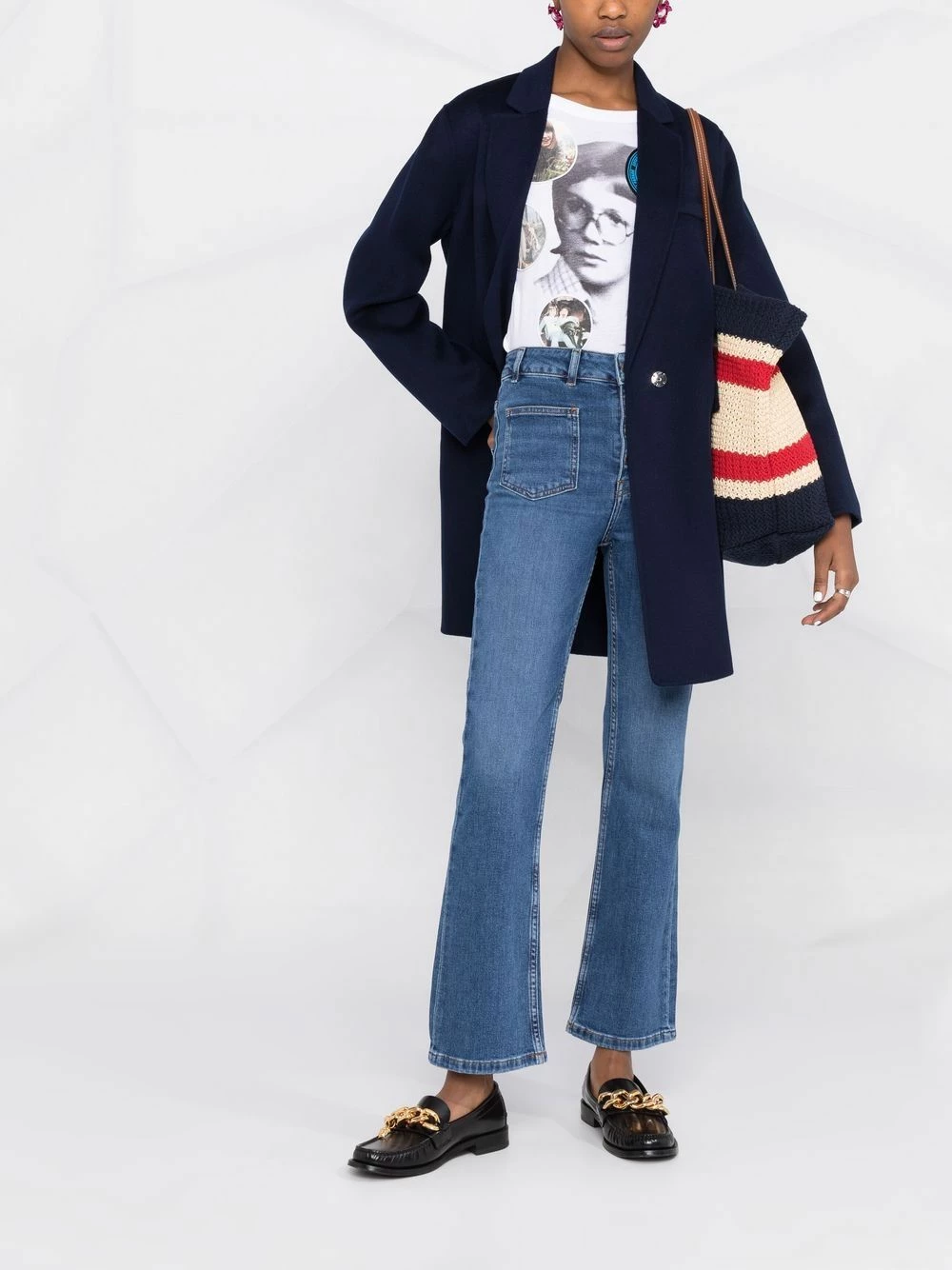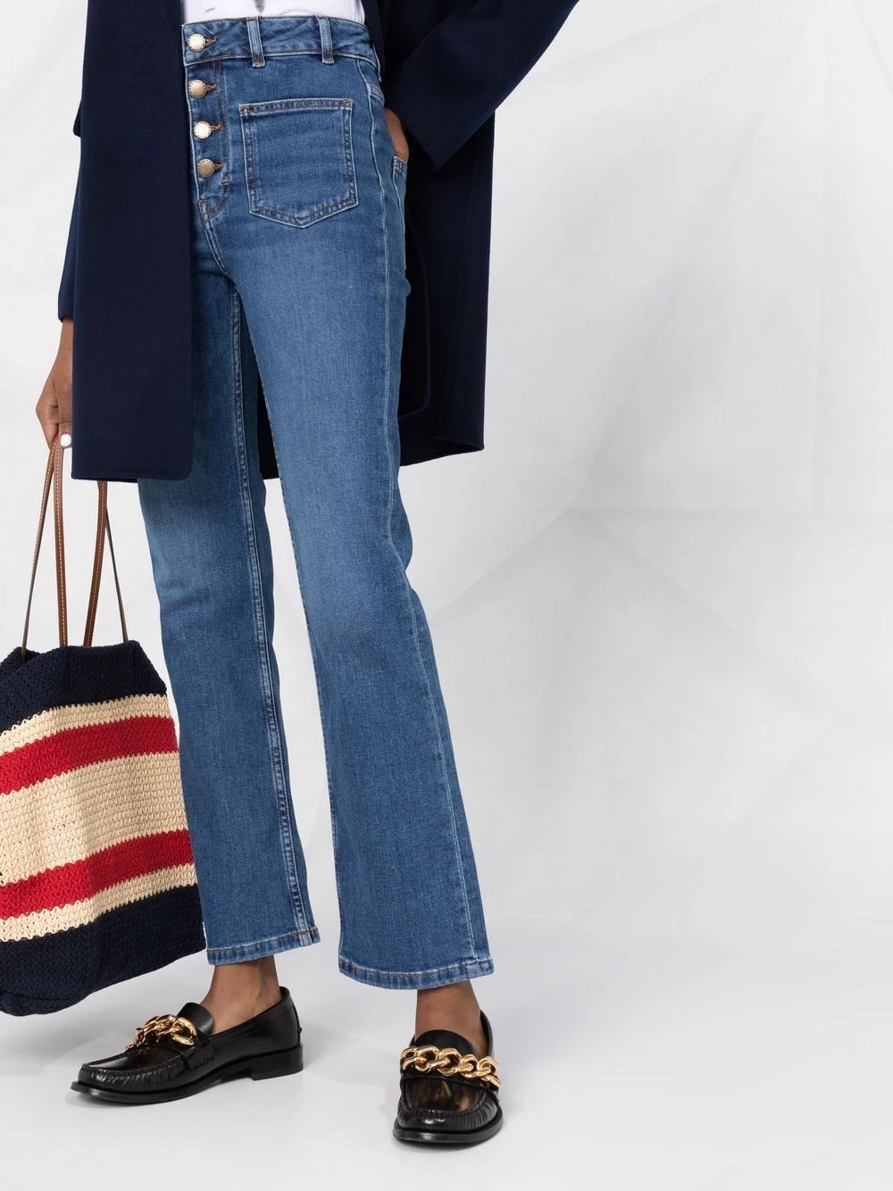 Crafted from stretch cotton denim in a blue hue, these high-waisted jeans from Maje boast a flared cut and are detailed with an exposed button-fly fastening.