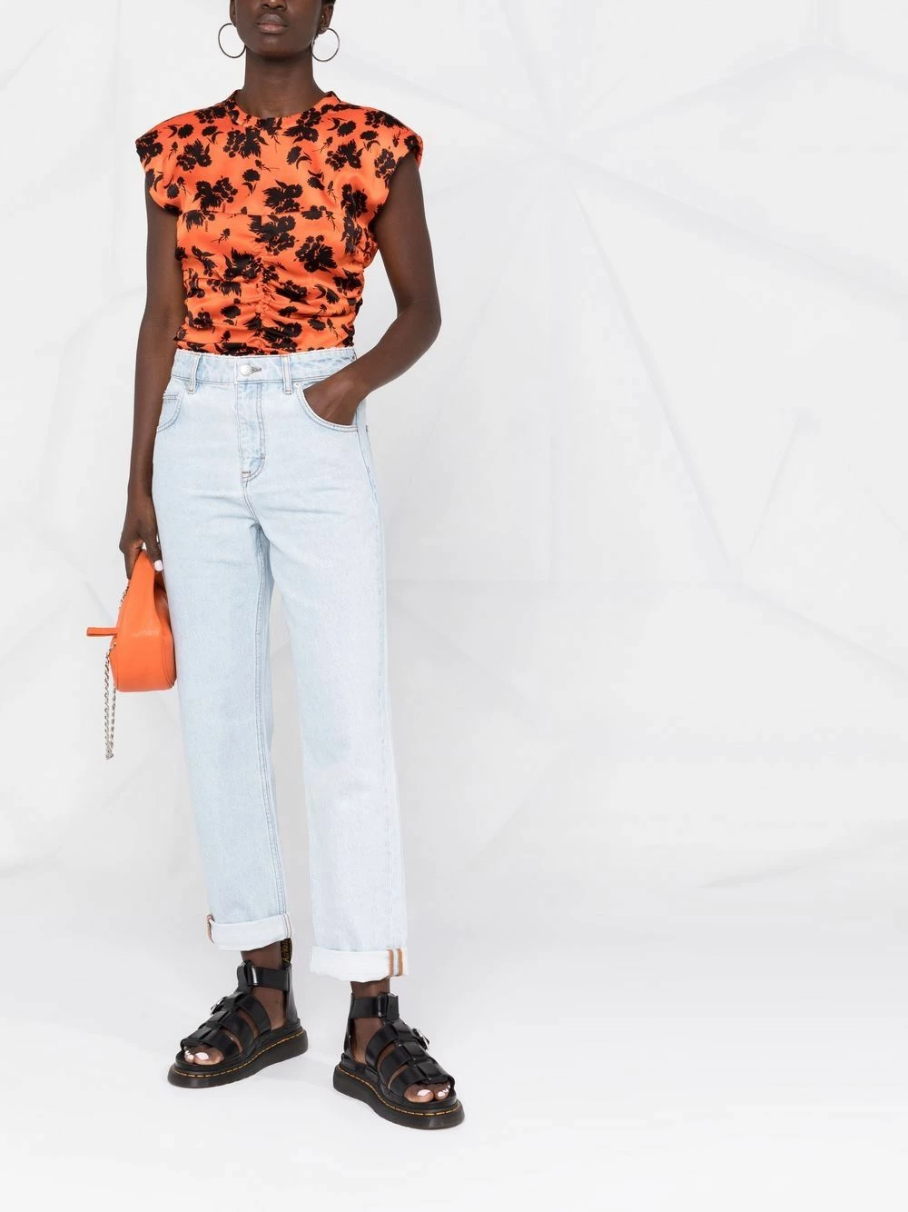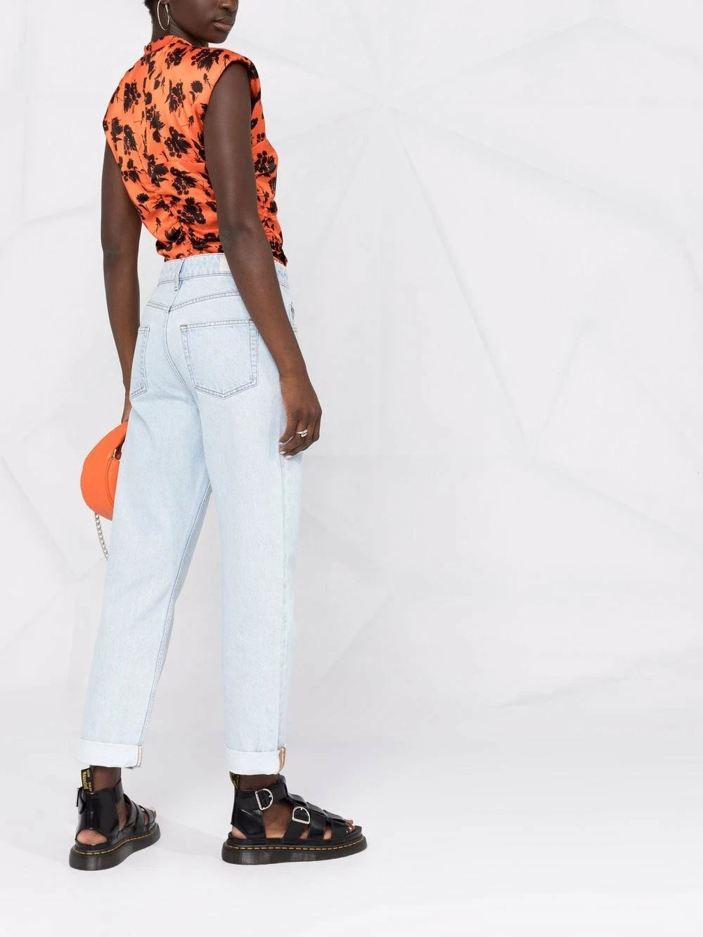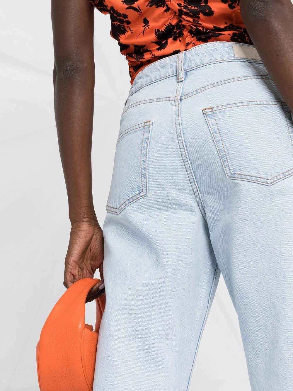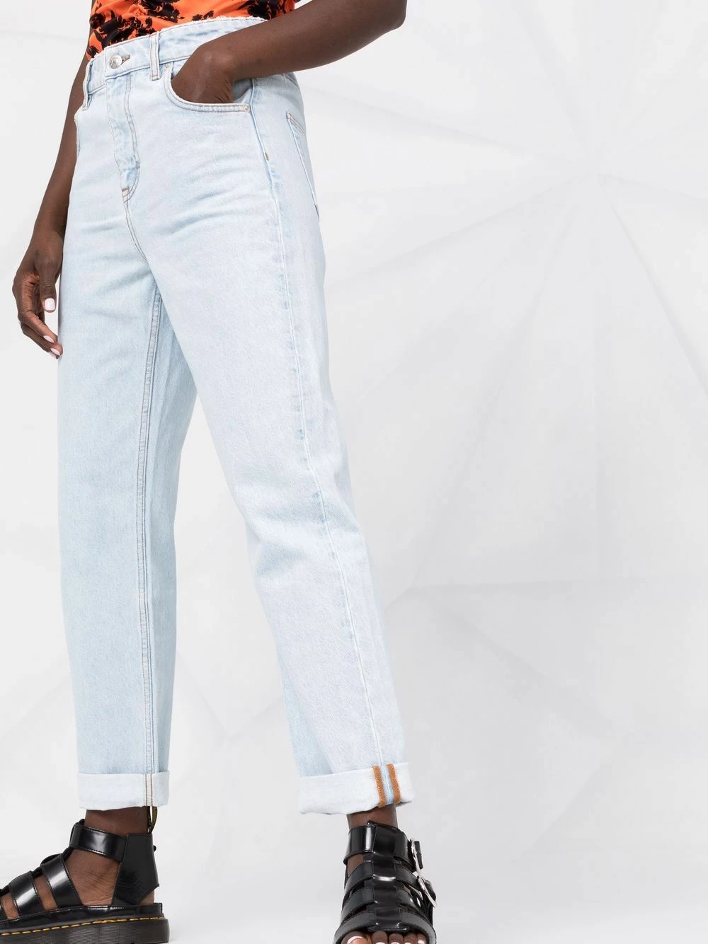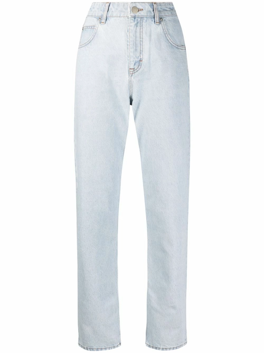 Sky blue cotton-denim high-waisted straight leg jeans from Maje featuring high waist, button fly fastening, belt loops, classic five pockets and straight leg.