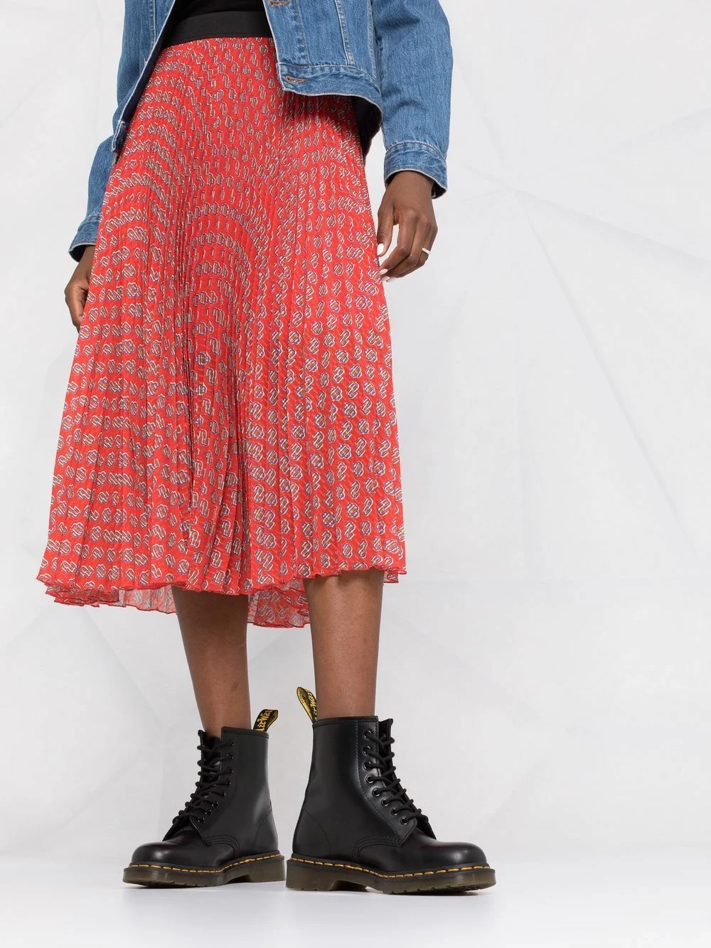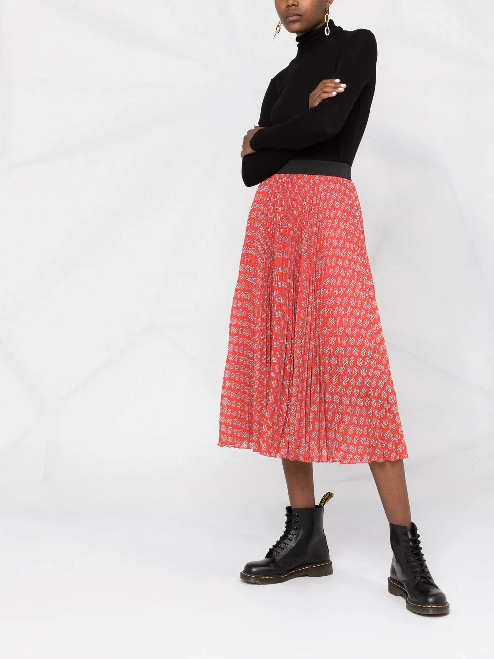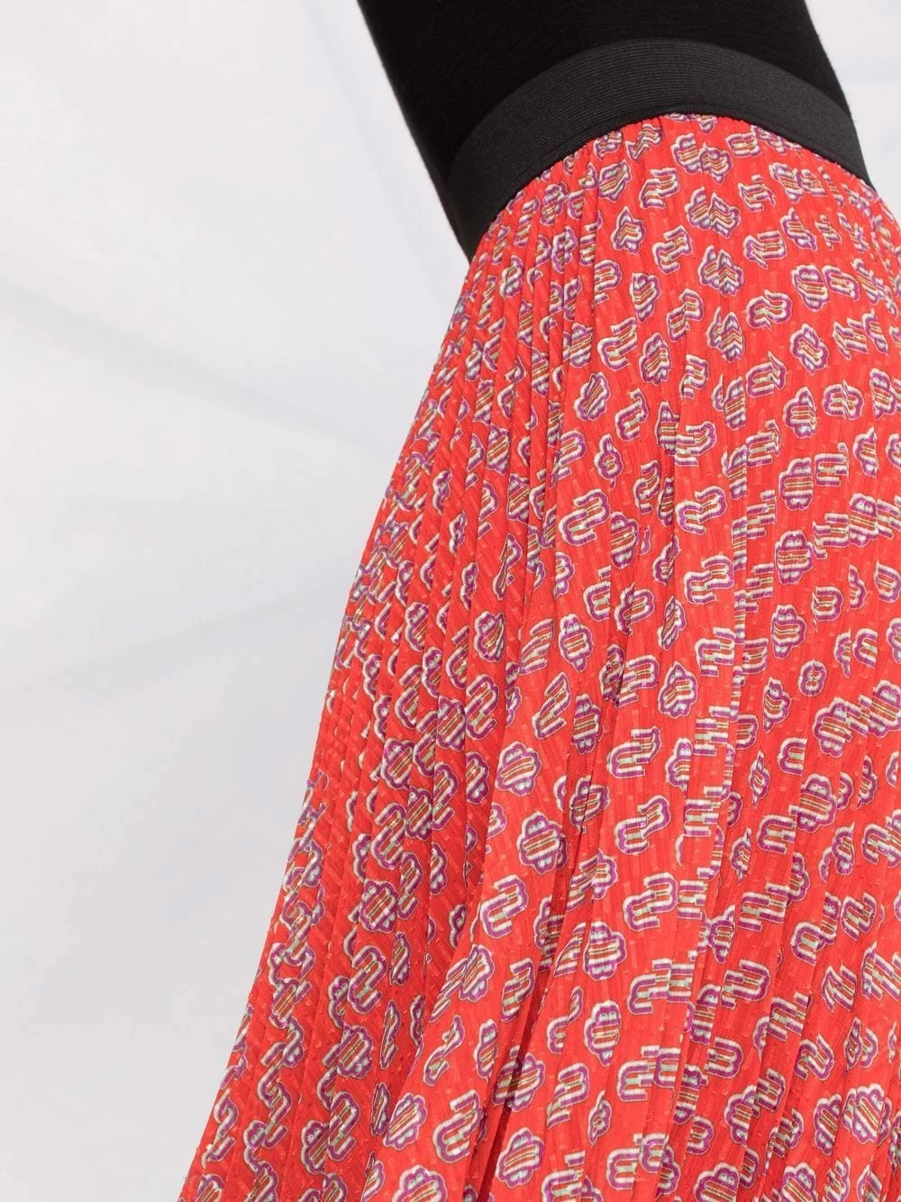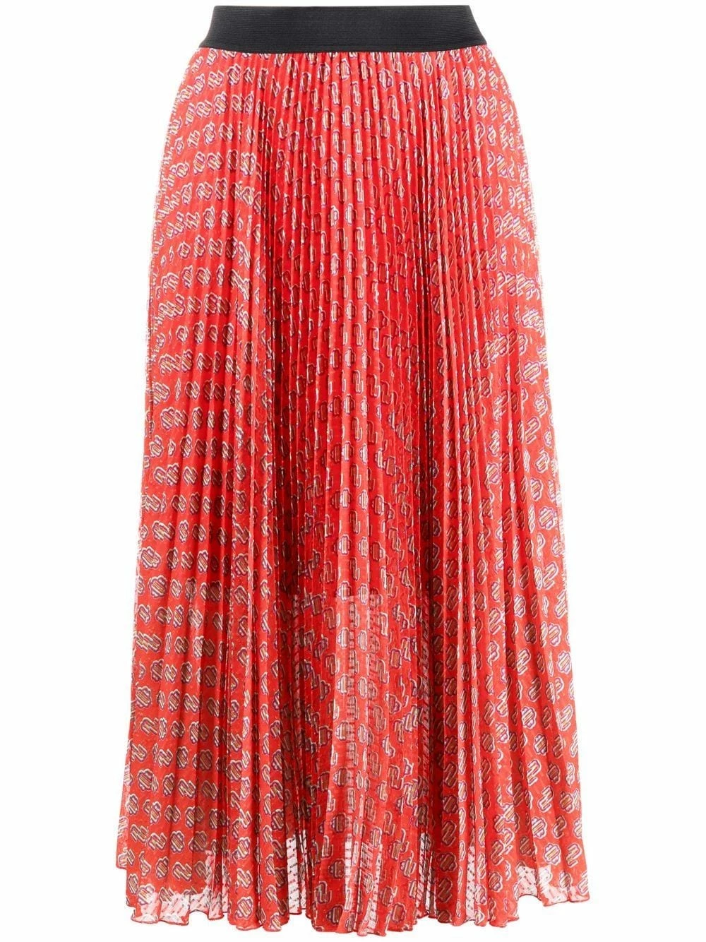 Red/multicolour monogram-print pleated midi skirt from Maje featuring fully pleated, monogram pattern, high waist and elasticated waistband.