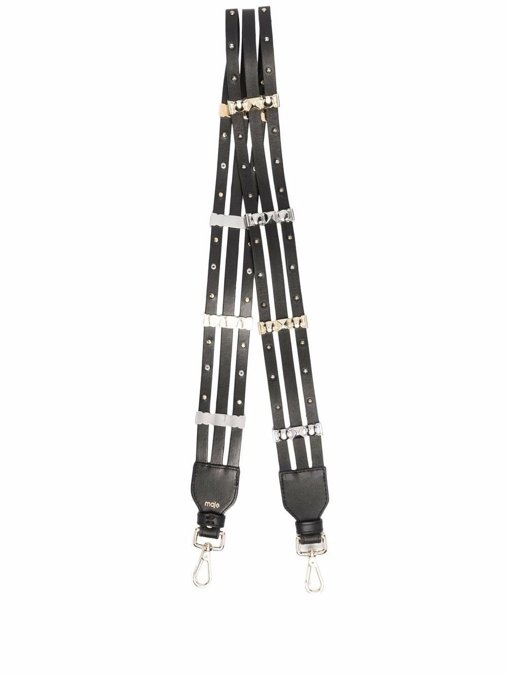 Black leather studded leather shoulder strap from Maje featuring grained texture, stud detailing, eyelet detailing, logo print to the rear and clip fastening.