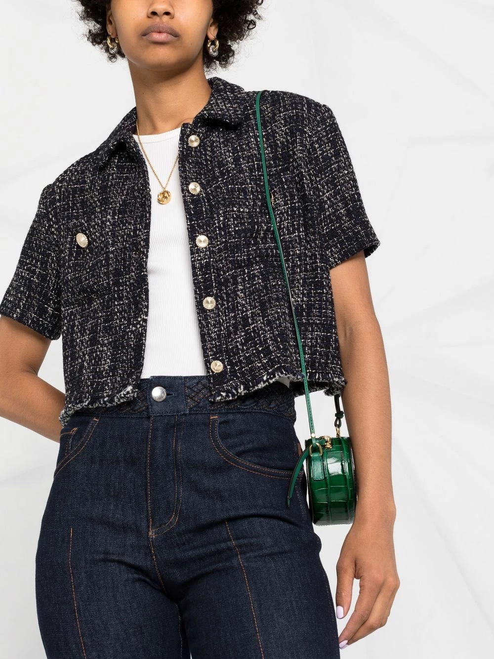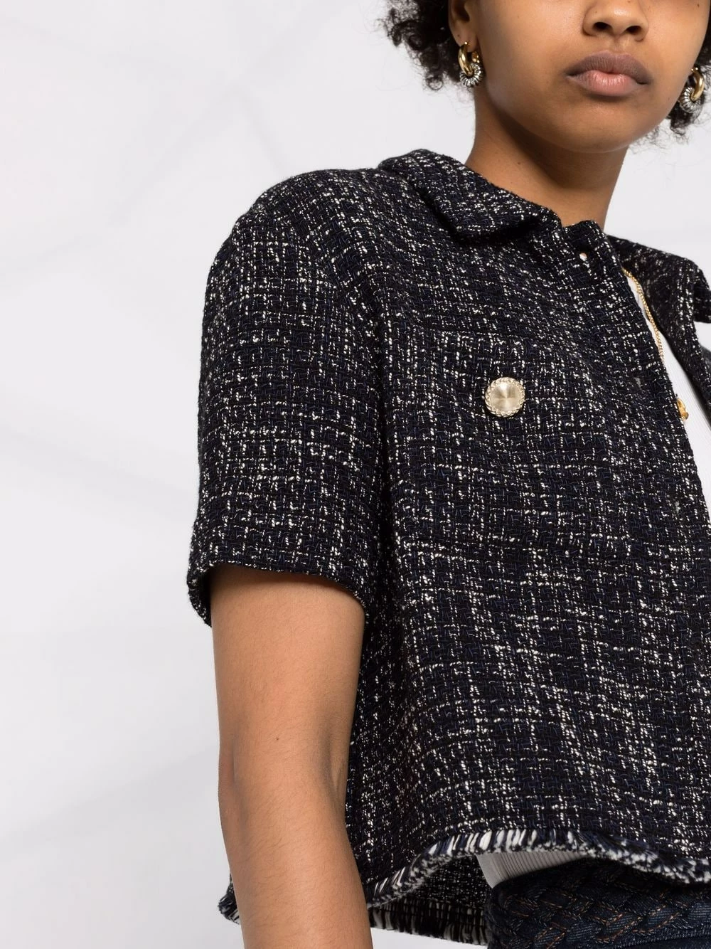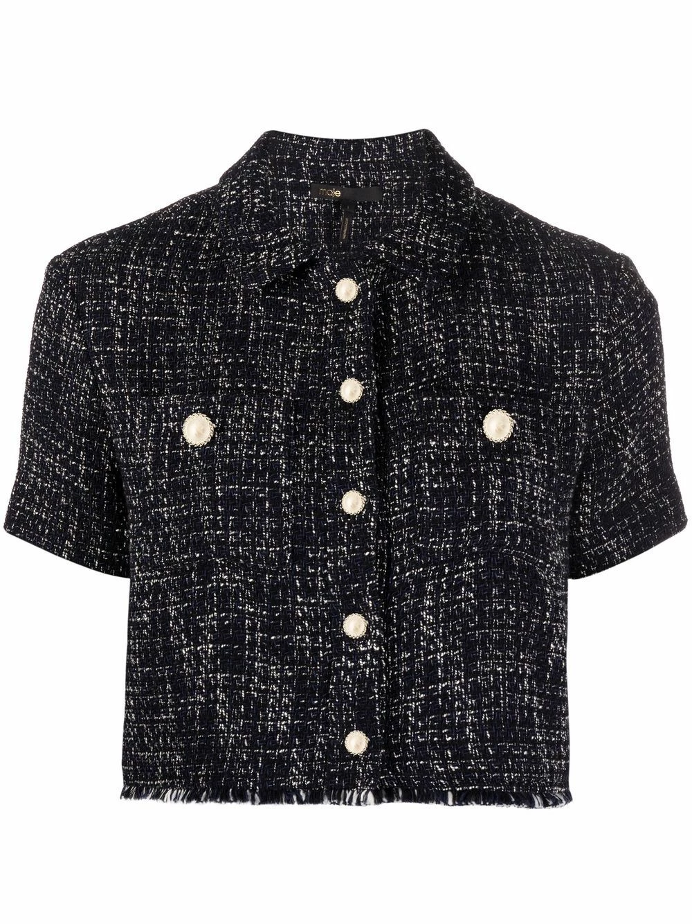 Marine blue organic cotton tweed buttoned shirt from Maje featuring tweed, raw-cut edge, decorative button detailing, front button fastening, round neck, short sleeves and cropped.