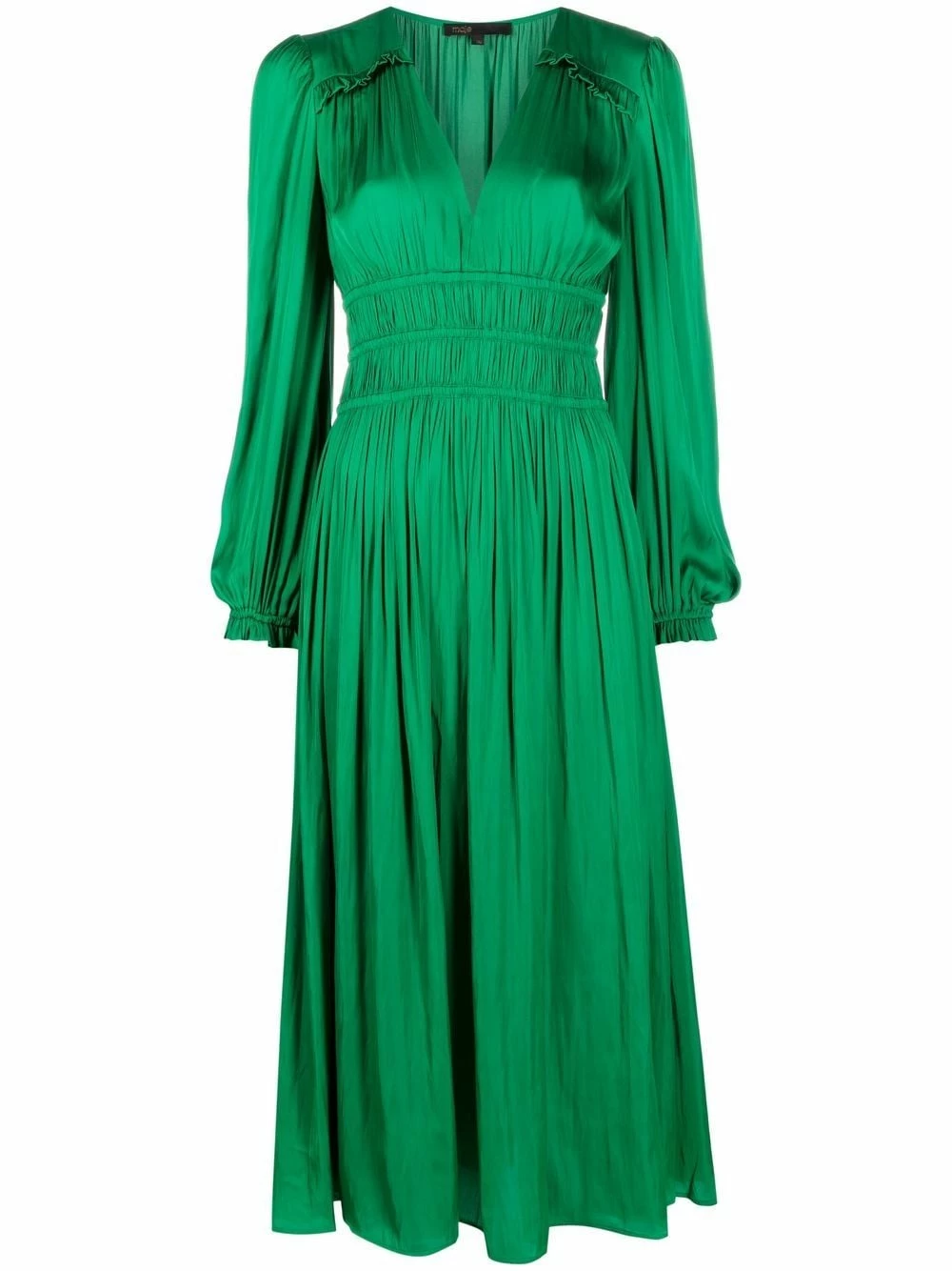 Maje commits to reducing their environmental impact gradually every season and as part of their AW21 collection, the main fabric of this V-neck dress is made from recycled polyester. Featuring flowing sleeves with elasticated cuffs and a gathered waist, the full skirt and ruffled details make for a fluid silhouette.